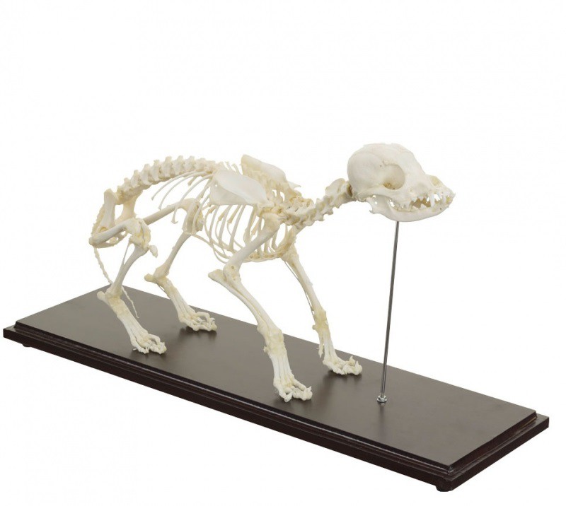 A skeleton model of a dog on a wooden base. It is an excellent didactic aid, it is used for demonstration purposes.