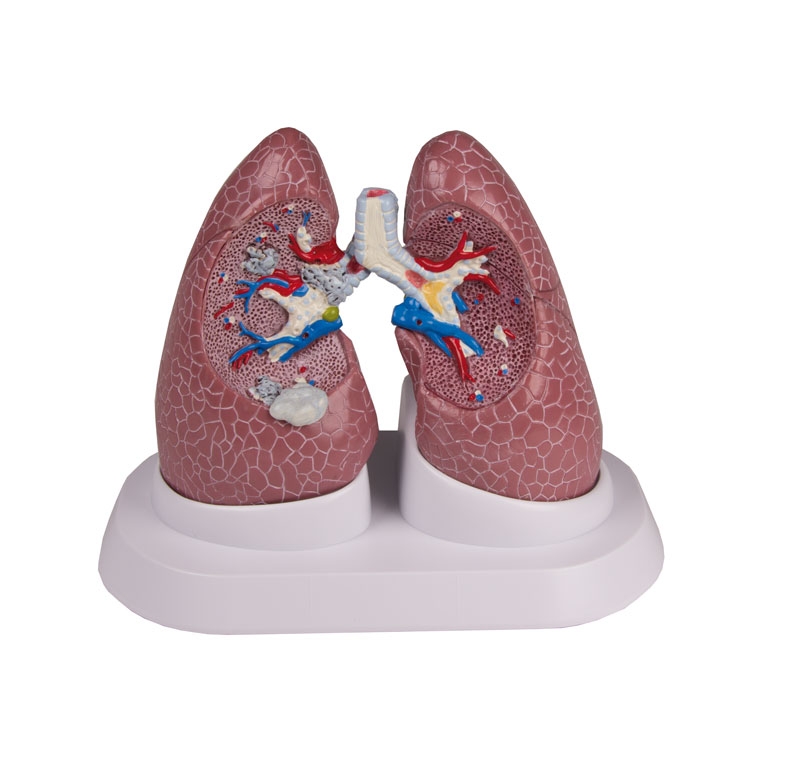 Lungenmodelle in natürlicher Größe mit zweiseitiger Pathologiedarstellung. Ein Modell zeigt auf der einen Seite die gesunde Anatomie, die andere Seite zeigt die Effekte einer chronisch obstruktiven Lungenerkrankung. Das zweite Modell zeigt einseitig Krebs, auf der anderen Seite Asthma.