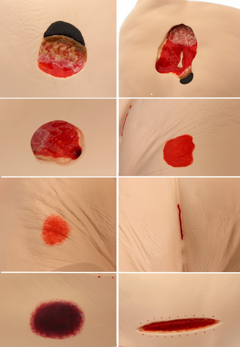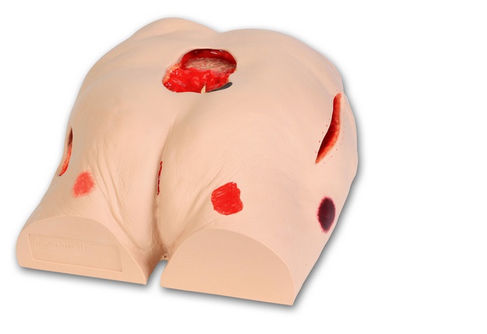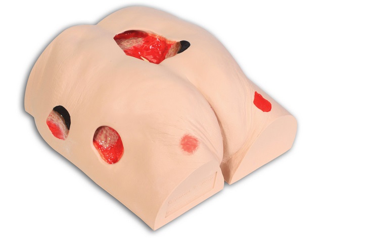 This new, improved version of the approved Decubitus-Simulator is made of even more realistic material and is perfect for dressing practice. The model was molded from a 74-year-old patient and shows the following pressure ulcers: Stage I, stage II, stage III and Stage IV. It also shows a suspected deep tissue injury (DTI), a unstageable eschar/slough wound and a 14 cm dehisced wound. Life size.
